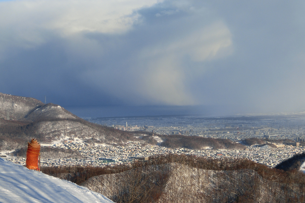 ヒエヒエばんけいは快晴の朝です石狩湾方向には怪しい大雲が渦巻いてます