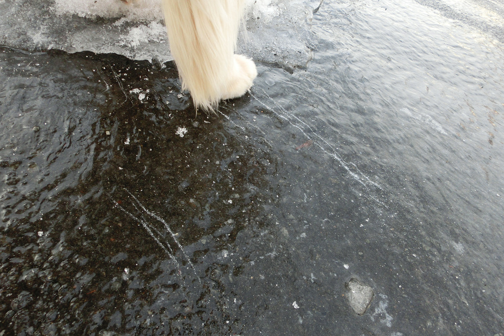 Dogs スペシャルシューズ 暖気で融けた路肩の雪が凍結したブラックアイスバーン四肢の爪でも滑り気味こんな日の散歩にはスパイクピン付きシューズが登場インソールを入れて履き心地を若干改善してます 2016.03.09 Dogs