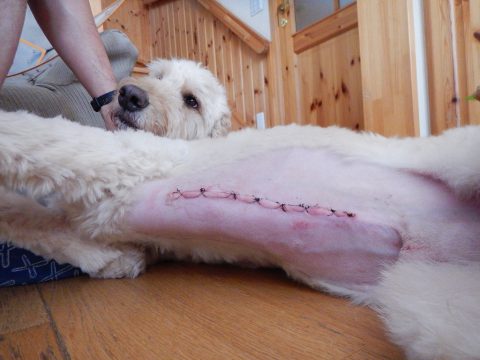 お腹の大きな縫合跡。胃もボールを取り出すのに5cm程切開したので、完治には1か月かかるそうです。動いた拍子に血液が滲むことがありますが、診察の結果、炎症は起きていないので包帯は巻かずに乾燥させることにしました。