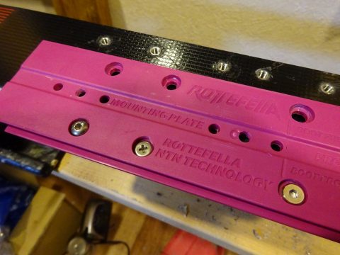 インビス化してビンディングを固定するステンレス/M5サイズのネジ。今回、Freerideを装着しようとしたら、頭が若干出っ張ってしまいビンディングが干渉してしまいました。
