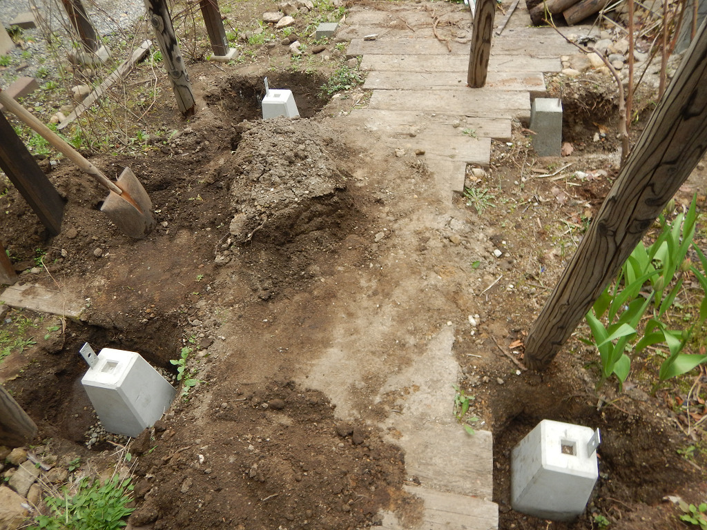 garden ブドウ棚の作り替え ブドウ棚の支柱の2本は地表の高さで朽ちており、残りの1本も軽く蹴り込むと同じ位の高さ崩壊。最後の1本は鋸で少しだけ切れ目を入れてると簡単に折れたので、ブドウを乗せた状態で横に移動。地中に残った柱を引き... 2020.05.04 garden