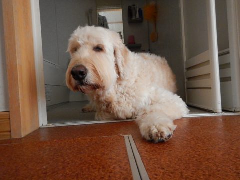 『休憩しませんか』。このところ、お風呂場に陣取るロン。