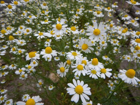 こぼれ種で一挙に領域が広がったカモミール。和名はカミツレ、スペイン語ではmanzanilla。