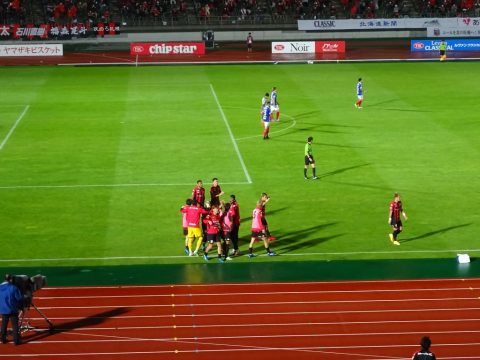 前半、コンサドーレは向かい風。霧雨も降ってジットリ寒い。