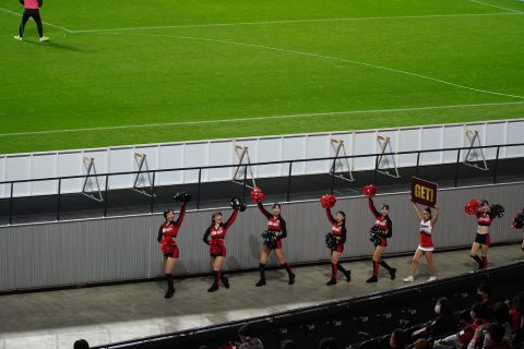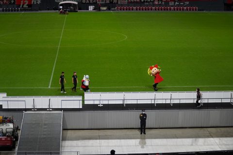 オープニングパフォーマンスを終えたコンサドールズ。メイン側からピッチ下を半周してバックスタンドに戻ってきます。