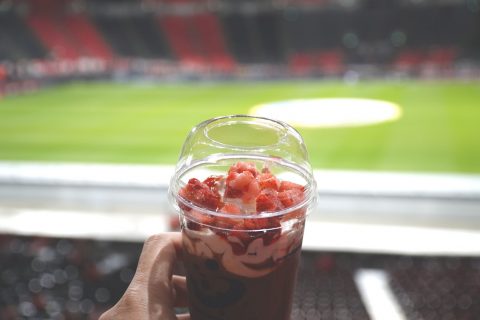 「頑固おやじのカレー」を食べてデザートには「赤黒ストロベリー・ココア(コンサドーレ太鼓判メニュー by 6高嶺選手)」