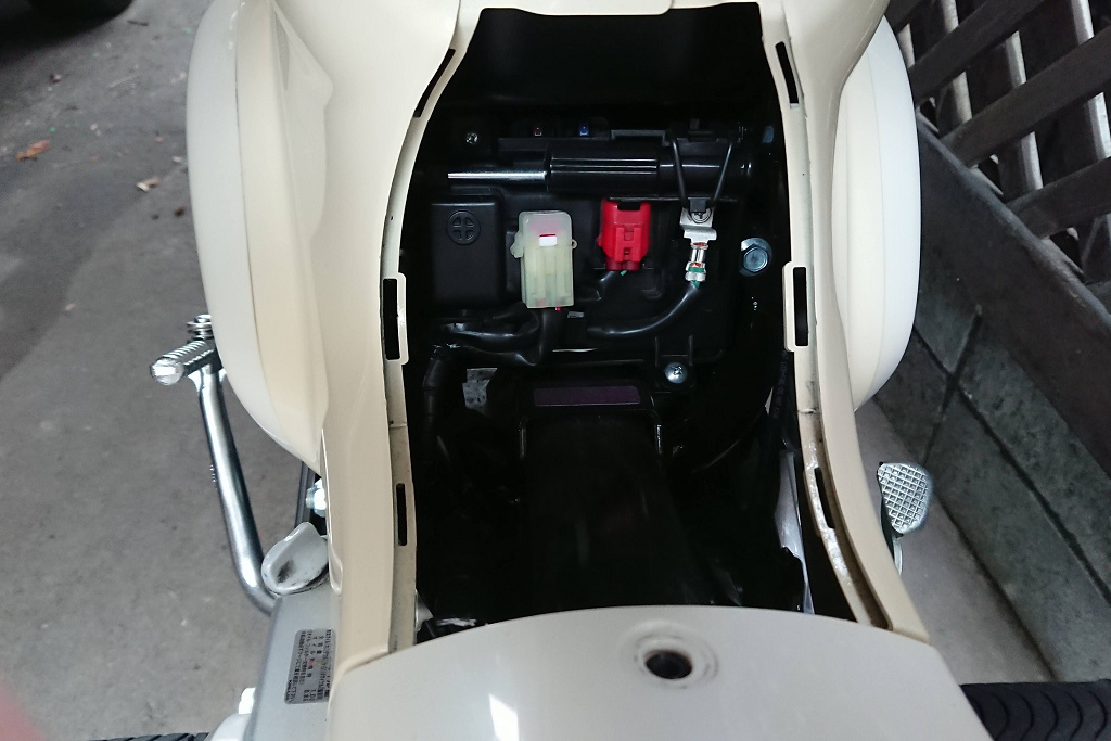 センターカバーを取り外して、バッテリーのマイナス側のネジを抜きます。