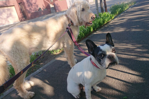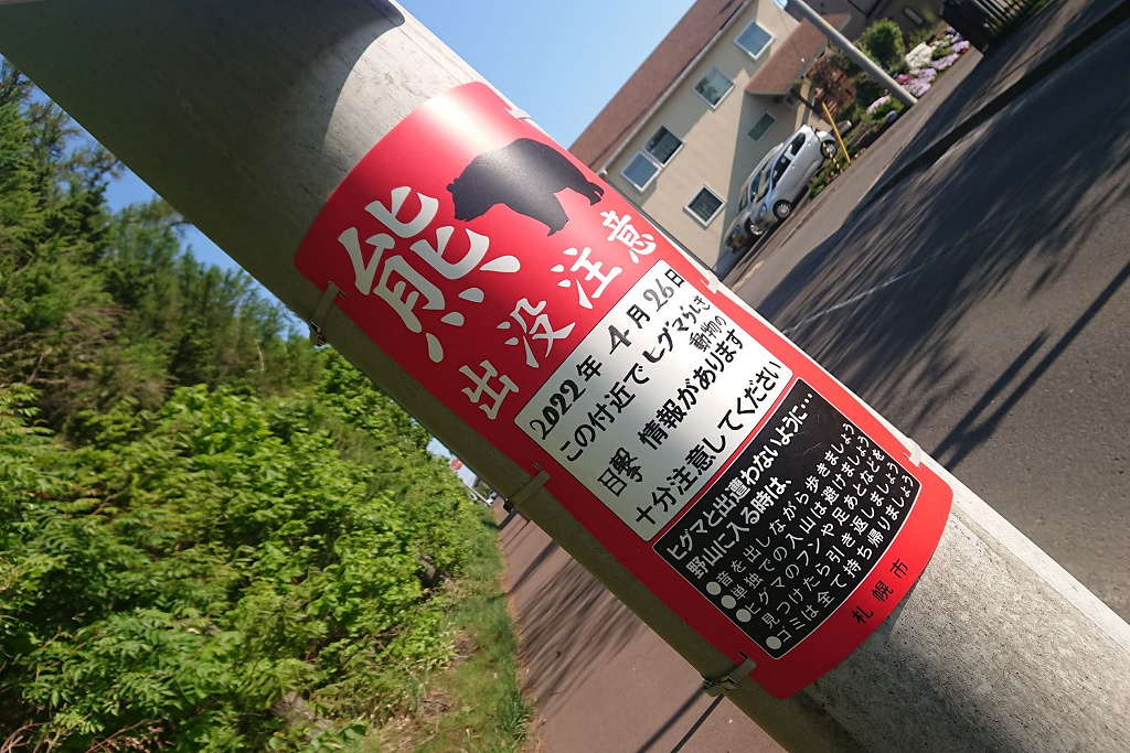 熊情報 Dogs 2022.05.17 朝のお散歩。いつもと違う道を歩いてみた。 路側のスズランが花盛り。 ニコちんは草とタンポポが好き。『あの赤い看板はなんだ?』 あらまっ。裏山から出てきたのかねぇ。