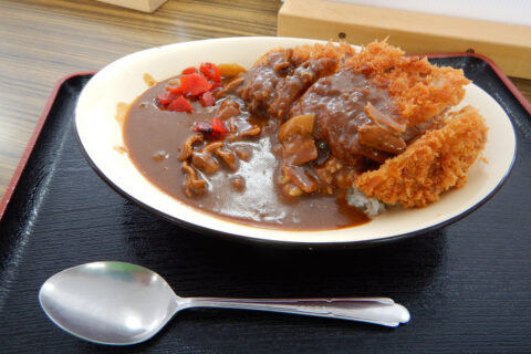 ロッジのカツカレー950円はボリューミー。オーダーしてから揚げてくれます。ユー達が大挙するスキー場の高価なゲレ食と違いコスパ最高。