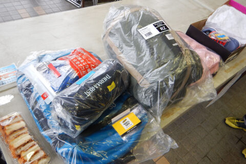 ザック、KEENの購入引換券、サーマレスト、メッシュインナー、寝袋、デイパック、シューズ(カツサンドは景品と違います)