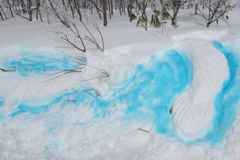 第2リフトの降り場に散っていた青色はドラゴンの背景でした。木の枝を龍の角と髭に見立ててるとこがポイント。