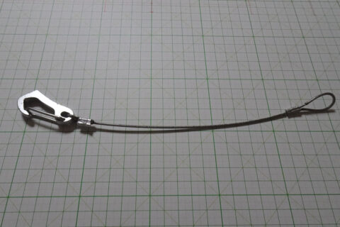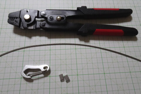ステンレスワイヤ-:径2mm(ワイヤー径1.5mm+ビニール被覆0.5mm)×30cm、8文字型アルミスリーブ:2個。スリーブが掛かる部分の被覆はバーナーで炙って剝がしてかしめました。