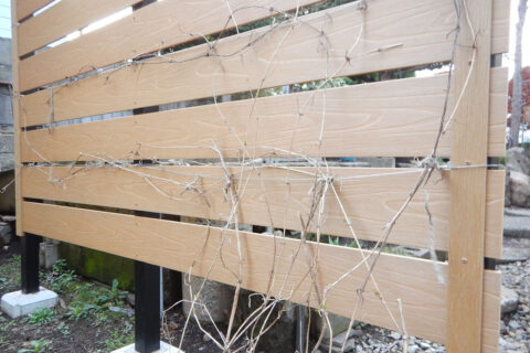 昨年作り直したフェンスに麻紐でクレマチスを誘引を誘引していましたが、雪の重みで切れてました