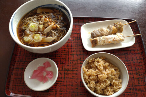 「ピパの湯ゆ~りん館」の美唄名物よくばりセット(鶏めし・美唄焼鳥・きのこ蕎麦)1,000円、焼鳥がパサついていたのはちょっと残念だったけどゲレ食よりこっちだな