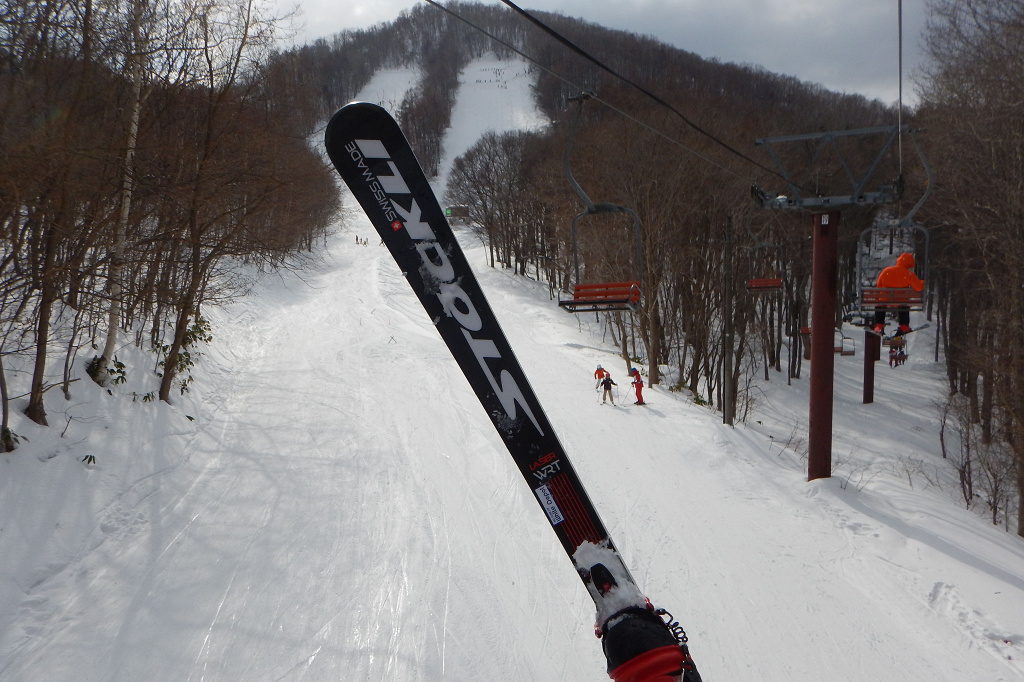 気温が上がってバーンが緩むとエッジコントロールがシビアになってお手上げ、小雨もパラツキはじめたのでお昼で撤収!