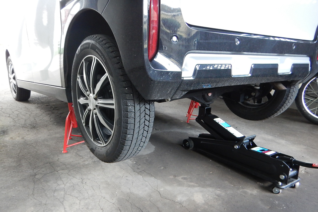後輪はすんなりとリフトアップできたけど、フロントは車高が低くてフロアジャッキが入りませんでした
