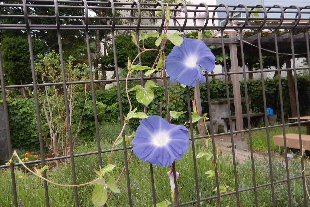 garden種を蒔くのが遅かったのか、発芽後しばらくラベンダーの影に隠れて日当たりが良くなかったためか、アサガオがやっと咲き始めました