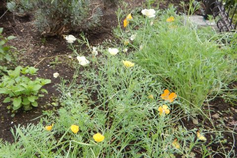 大繁殖していたミントを伐根し、日が当り始めて弱々しく咲くポピー