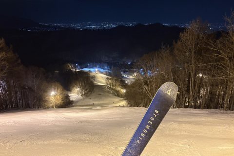 Ski硬いアイスバーンの上にザラメ状に砕けた氷が散乱する、春のナイターによくあるコンディション